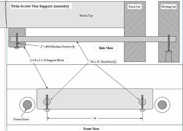 My workbench is equipped with a Veritas twin-screw vise on the end of the top. My top has a 16" overhang, to accommodate the vise. Before I bought the vise, the only significant criticism I ever read about the Veritas was that the moving jaw of the vise tended to drop nearly 3/8" at full extension in actual use. These may be one reason why Veritas recommends a slanted (tapered) front on the moving jaw. So, I designed a support carriage that practically eliminates that flaw and provides other useful benefits. I made my support using two 18", 5/8" dia. steel guide rods that are fastened securely to the end jaw at one end and to a solid block on the other end. Then I used #10 machine screws to pin the ends. The guide rods pass through the fixed jaw on the bench that serves as a bearing. As the vise is opened, the solid block slides underneath the bench and supports the jaw of the vise. I made my support block by gluing up flat three, 3/4 x 2-3/4 x 18 hardwood pieces. I positioned the holes 16" apart, just to the inside of the power screws. I also made sure that the 5/8" holes in the fixed jaw and the moving jaw were set so that the tops of the guide rods were just above (about 1/8") the tops of the power screws. That way, any stock clamped in the vise would rest on the guide rods rather than the power screws. This has been very useful because it is much easier to clean the guide rods with an abrasive than it is to clean the power screws. The smooth rods also do not scratch the work piece as the jaws move. Power screws would tend to mar soft surfaces when making contact. My vise support holds the end vise vertically so that there is practically no vertical drop even at full extension--even when I put some weight on it. By eliminating this drop, I also have better clamping when using the dogs on the vise together with dogs on the bench. And, I decided it was unnecessary to slant the face of the moving jaw. I notice practically no drag during use, but to help this out, I added a little wax on the top surface of the solid support block and buffed it before installing it. About once a year, I rub on a little more. Best, Edwin |