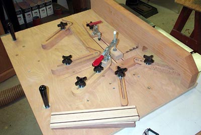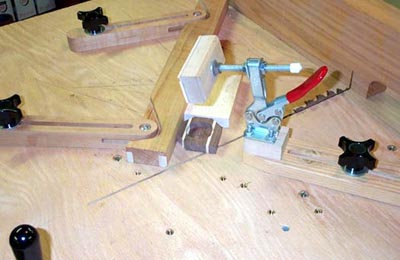 Hope that helps From: lomax Ron, The book Dave refers to is available from the Sno-Isle library system. From: Joe Lyddon Dave, I'm finally getting my TS cutoff sled into the 'making' process. I have thought of using T-slots for mounting clamps, etc. and changed my mind because I thought it would weaken the sled. Then, I remembered these pictures and finally found them again! Questions: 1. Are those steel 1/4" inserts or T-nuts mounted from the bottom? 2. Are those slotted wood pieces made from one piece or glued pieces? 3. What kind (brand/model) are those hold-down clamps? 4. I see a lot of vaccant places to attach things. . . do you just add points to cover a need as it happens or is there some other logic behind their placement? 5. Do I see a small block of wood attached to the end of a clamp (to hold small thin pieces?) 6. What are those vertical handles doing at the back-side of the sled? Surely, you don't reach over the sled to get to them. Taking this approach, one can just add additional tie points as the need arises, etc. which really makes sense to me. I can see where you'd better be careful or you could really cut the wrong the things! Thank you. From: daveknipfer Another blast from the past .... I see Joe is effective at seraching the archives! Let's see .... 1. Those are 1/4" threaded inserts. 2. The slotted arms are one-piece ..... I routed the grooves and cut the open end on my table saw. 3. They are DeStaco toggle clamps ..... you can find them in most any WW catalog in a variety of sizes and styles. 4. All the 'empty' inserts you see here were added over time as my clamping needs demanded ..... somehow it seems like every new project wants a different configuration of clamps so all those inserts just kind of grew over time. 5. The small block of wood is actually a piece of 1/4" plywood that is the sacrifical surface to keep from chewing up my clamp. I only use it on the piece that fits over the saw kerf .... and set the saw height to cut into the plywood not my clamp. When it's all chewed up ... it's much easier to replace that part then my entire clamp head. DAMHIKT. 6. The vertical handles at the back of the sled are where I stand ...... that is the end nearest me. My hands go there and stay there ..... I can still count to 10!! From: Joe Lyddon Very good Dave! I pictured you adding inserts to meet the need as it happened. . . nice way to go! I have to go searching for STEEL inserts. . . I don't think Brass ones would be strong enough do you? I noticed those handles are actually in front of the saw (if you look at the saw blade), right? That is a very SAFE way to do it! Perhaps, sending the plans to Larry would be appreciated!? I also noticed the slot in the bottom of the back fence/support. Cool idea to enable longer pieces to be cut at angles, etc.! Very nice! Is the back fence/support perfectly square to the blade? If it wasn't, I can see how you could easily arrange those adjustable fences to be referenced from the saw blade slot. As far as searching the archives go, I had a project going where I needed to get some "back" pictures, etc. and it paid off in other areas at the same time! And I finally figured out how to do it! Thank you again, Dave, for all of your help. ![]() ![]() This site is maintained by: Good-Lyddon Data Systems Copyright © 2004-2005 Joe Lyddon, WoodWorkStuff.net |