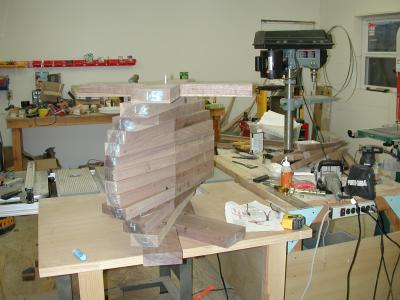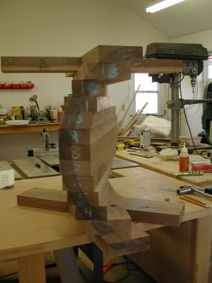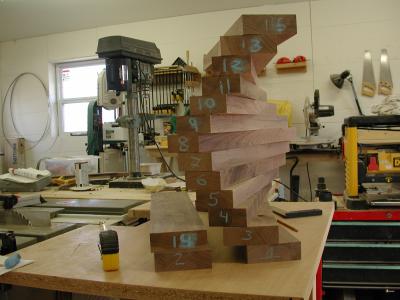 In the spirit of sharing project progress, here are some in-progress photos of my current project. Unlike some of the folks here who truly have skill and experience, I'm much more of a beginner. Hopefully, others in my boat will get something useful out of this as the project progresses. My wife saw some plans for a spiral coffee table that I downloaded from here: The Plans and asked if I could make something similar. I figured I might as well try, though the project will be a stretch for me. I've never shaped wood before, and the end result might not be too pleasing. Only time will tell. I looked over the plans and decided on a couple of modifications. I wanted the table taller and smaller than the plans called for. We'll see when its finished whether I succeeded. So far I'm 2 days into it, and I figure I have probably 10 days to go (which will take several weeks to actually accomplish). The first pic shows some additional wood blanks that I made from offcuts from the stack of blanks. I need 15 blanks to do the project. |