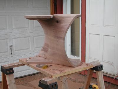 Well, I didn't get to the shaping until this weekend. Between yesterday and today, I have roughly 10 hours into the shaping and I'm down to detail work. Its been a pretty scary and gratifying process. I was real nervous hitting it the first time with the carver. After the first hit, I was committed, and plowed forward for 3 hours. I've used a combination of the Arbortech Pro4 Carver, 36-, 40- and 80- grit sandpaper wheels on the grinder, 60-grit on the ROS and a new french curve scraper I got today. I also decided to bevel the top and bottom edges during the shaping. The difference in the visual weight of the piece after beveling was amazing. I don't have any good pics of the shaping itself, as once I began I didn't really stop until the major shaping was done, and the chips and dust created were enormous. I filled up the tank on my shop vac (16 gallons) collecting dust and chips. My shop is still a complete wreck, with a heavy layer of walnut dust on everything. Luckily today I could work outside. For reference, here is the table before shaping and beveling: |