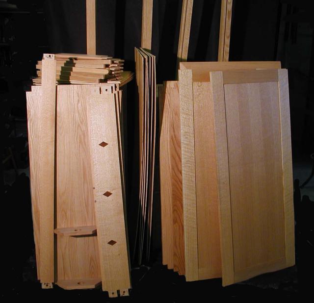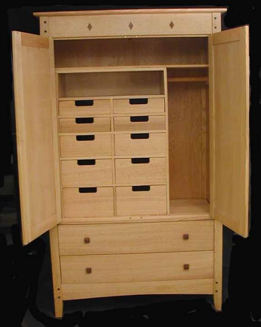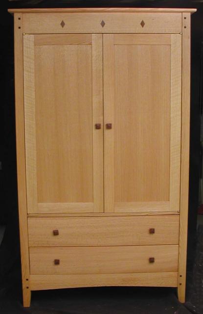 The armoire can be totally or partially disassembled to be moved. The doors, sides, & back are all made up of riff-sawn plywood. Since I couldn't find plywood that was good both sides, I ended up with 1/8" & 1/4" back to back. Frame, interior drawer unit, drawer fronts, & shelves are all solid Red Oak. Drawer sides are soft maple. All lumber purchased rough from local mill. Knife hinges are Brusso. Inlay diamonds, pegs and drawer pulls are rosewood. As with many projects, changes are required. The main one was trying to put the drawer unit into the armoire. It was originally slightly taller that the door opening. I thought we could tilt it and slip it in so that the top edge would be hidden by the top rail. It proved too heavy and awkward. I ended up removing the top and cutting it down and adding a shelf to sit on top. As it turned out, that was actually a better design. There are a couple of things I wish I had done. I should have waited and picked up some more wood in two cases. It really shows up in the photos. The top rail on the left door is darker than all the others and the second row of interior drawer fronts the same thing. I tried to make do with what I had. This was a challenging project and I learned a lot. It was definitely fun & worthwhile. Ready for delivery... |