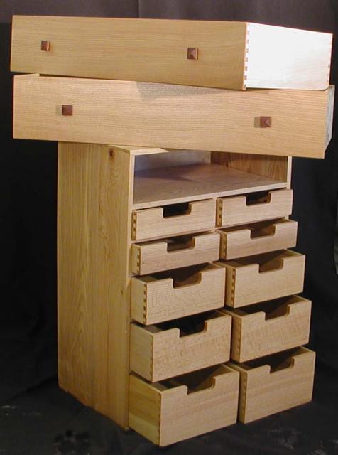 Mike Reese, 02-15-2004 06:37 PM About a year ago, I posted some info on an Armoire project I was starting. I finally finished it and delivered it yesterday. One of my daughter's mother in law had been looking for an armoire, but couldn't find what she wanted. She asked if I would consider building one for her. I, of course said, why not. After some discussion, I came up with three designs and we settled on one with 2 large drawers on the bottom and a 10 drawer unit inside with a little hanging space. |